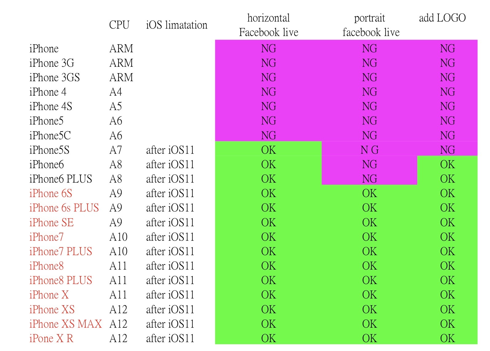 | support iPhone 6  ~ iPhone13. iOS11 above / iPadOS 11 above 1.basic function: (free use) 2. free app for iOS Capture card 3.auto login facebook live (profile / page / group) auto login youtube live atuto login twtich live custom RTMP (RTMPS) 4. add Logo function 5. 1920x1080 /1280x720/ 640x360 720x1280 (portrait mode for facebook live) | iOS11 above / iPadOS 11 abve 1. all function turn on & remove watermark: (need money) 2. money charge : US$2/ week for charge app 3.auto login facebook live (personal / page) auto login youtube live 4. PIP /video switch / overlay overlay: time, picture, score board and etc 5.1920x1080 /1280x720/640x360 6. see message for facebook live (profile, page, group) and youtube 7. write message for facebook live ( page only) and youtube |