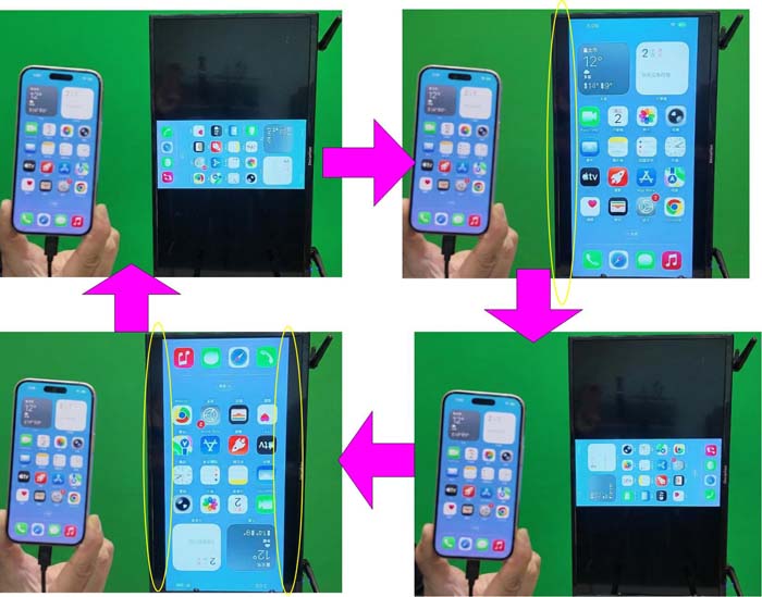 For mirroring a smartphone’s vertical screen to a TV, we offer three display modes.